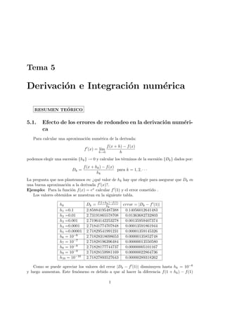 Este documento presenta métodos numéricos para aproximar derivadas e integrales. Explica cómo los errores de redondeo afectan al cálculo numérico de derivadas y presenta fórmulas de diferencias divididas de 3 y 5 puntos. También introduce la extrapolación de Richardson para mejorar la precisión de las aproximaciones mediante el uso de múltiples mallas. Finalmente, incluye ejemplos de código para implementar estos métodos.