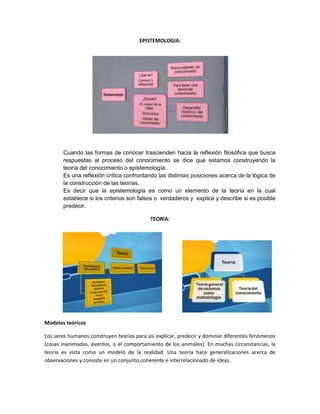 La epistemología estudia los procesos de conocimiento y cómo se construyen las teorías. Busca establecer si los criterios de una teoría son falsos o verdaderos y si es posible predecir con ella. Las teorías son modelos que explican, predicen y dominan fenómenos a través de generalizaciones sobre observaciones. La teoría general de sistemas considera que un sistema debe estudiarse de forma integral, englobando todos sus aspectos y niveles. Analiza las correspondencias comunes a diferentes sistemas para comprenderlos. Un problema de investig