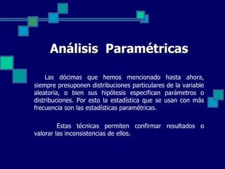 El documento proporciona una descripción general de los análisis paramétricos y no paramétricos. Explica que los análisis paramétricos suponen distribuciones particulares de las variables y especifican parámetros, mientras que los análisis no paramétricos no tienen tantos supuestos. A continuación, resume varios métodos paramétricos comunes como la prueba t, ANOVA y regresión lineal, y métodos no paramétricos como la prueba Ji cuadrada y coeficientes de correlación de rangos.