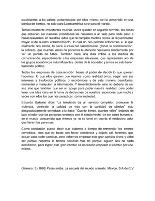 El documento critica aspectos de la sociedad y la educación actuales, señalando que los valores se han perdido y las acciones incorrectas se favorecen sobre las correctas. También denuncia que los medios de comunicación y las grandes empresas manipulan la información para sus propios intereses en lugar de apoyar a la sociedad. Finalmente, argumenta que es necesario un cambio empezando a nivel individual para corregir los errores del pasado.