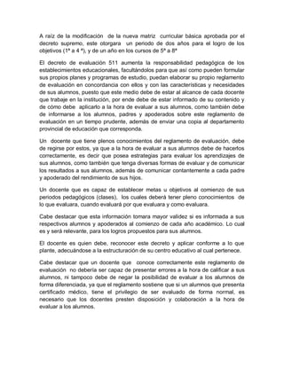 El decreto 511 establece nuevas pautas para la evaluación de estudiantes en Chile. Un docente debe conocer este decreto para poder evaluar a los estudiantes de manera apropiada y comunicar sus resultados a los padres. El decreto aumenta la responsabilidad de los establecimientos educativos para elaborar sus propios reglamentos de evaluación. Un docente debe aplicar las pautas de evaluación de su institución y estar informado para evitar errores en la calificación de los estudiantes.