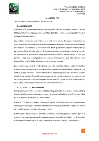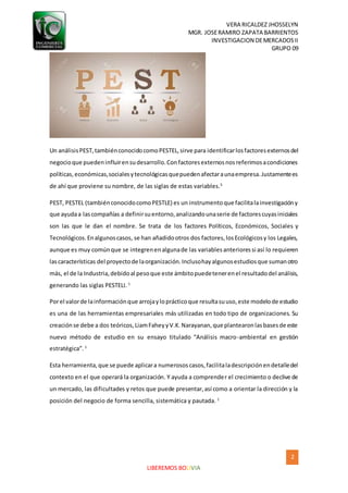 El documento presenta el análisis PEST, una herramienta que ayuda a identificar factores externos políticos, económicos, sociales y tecnológicos que pueden afectar a una empresa. Este análisis permite a las organizaciones anticipar tendencias y definir estrategias para adaptarse al entorno de negocio. Se describen en detalle las variables relevantes y su impacto en el desarrollo empresarial, así como la importancia de la adaptación constante al contexto cambiante.