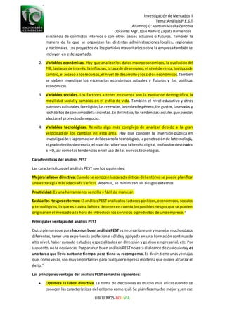 Este documento proporciona una introducción al análisis PEST (factores políticos, económicos, sociales y tecnológicos) como una herramienta para evaluar el entorno externo de una organización. Explica que el análisis PEST clasifica los factores en cuatro categorías y analiza cómo cada una puede afectar un negocio. También describe las principales ventajas del análisis PEST, como optimizar la toma de decisiones, evaluar riesgos externos y mejorar la adaptabilidad a cambios.