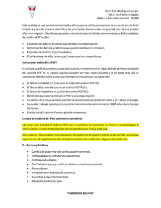 Este documento presenta un análisis PEST de los factores políticos, económicos, sociales y tecnológicos que afectan a una empresa. Explica que el análisis PEST permite identificar tendencias futuras y desarrollar estrategias para aprovechar oportunidades y defenderse de amenazas. Detalla cada uno de los factores del análisis PEST y cómo pueden influir en una organización. Finalmente, ofrece consejos sobre cómo realizar un análisis PEST propio.