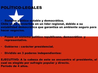 Chile tiene un sistema político estable y democrático con tres poderes independientes. Su economía es la sexta mayor en América Latina y pertenece a la categoría de ingresos altos. El país tiene una infraestructura tecnológica y de transporte avanzada pero enfrenta desafíos ambientales de la industria minera y otras actividades.