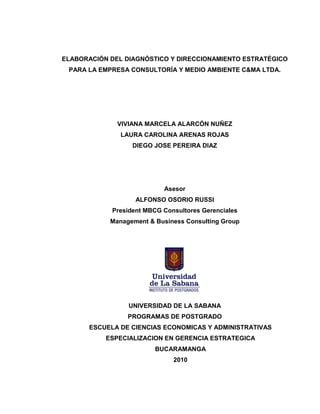 Este documento presenta el diagnóstico y direccionamiento estratégico realizado para la empresa Consultoría y Medio Ambiente C&MA Ltda. Se realizó un análisis del entorno interno y externo de la empresa para identificar sus fortalezas, debilidades, oportunidades y amenazas. Con base en esto, se definieron la misión, visión, valores y objetivos estratégicos de la empresa, así como iniciativas estratégicas alineadas para mejorar su desempeño.