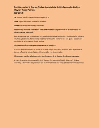 Este documento presenta un análisis de cinco bloques sobre el tema de los números naturales, fraccionarios y decimales. En tres oraciones: (1) Introduce los subtemas de números naturales, fraccionarios y su lectura, escritura, comparación y operaciones; (2) Explica cómo representar y ordenar fracciones y decimales en una recta numérica y dividir números fraccionarios; (3) Describe resolver problemas de múltiplos, divisores, permutaciones y razonamientos sobre valores fraccionarios y decimales.