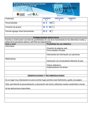 Este documento analiza las posibilidades didácticas de la herramienta Webnode. Se identifica Webnode como una herramienta gratuita y personalizable para crear páginas web y comunidades virtuales, con posibilidades de uso en áreas como Informática e Matemáticas. Se recomienda Webnode como un lugar interesante para crear páginas web de forma fácil y gratuita que permiten la personalización y decoración.
