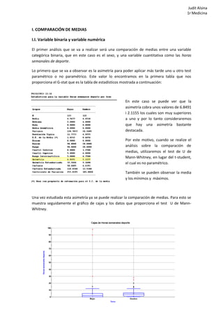 Este documento presenta tres resúmenes de análisis estadísticos realizados en un proyecto. El primer análisis compara las medias de horas de deporte entre sexos y encuentra que los hombres practican más deporte. El segundo analiza la relación entre sensibilidad al PTC y peso, encontrando que personas con mayor peso son más propensas a no detectar el sabor de PTC. El tercer análisis encuentra una correlación débil entre consumo de chocolate y caries, sin poder sacar una clara conclusión sobre su relación.