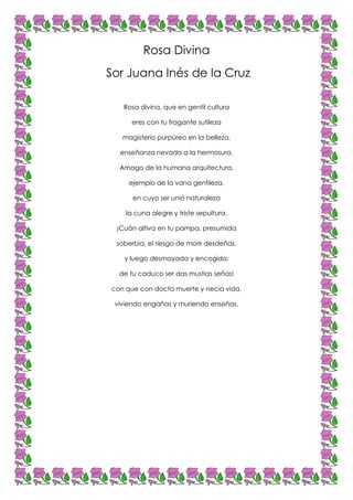 Este poema de Sor Juana Inés de la Cruz titulado "Rosa Divina" es un soneto compuesto por dos cuartetos y dos tercetos con rima consonante. Describe a la rosa como un símbolo de belleza pero también de fragilidad y mortalidad, pues aunque se muestra hermosa también esconde espinas y se marchita con el tiempo al igual que los seres humanos envejecen y mueren. El análisis estructural indica que utiliza figuras literarias como la sinestesia, la metáfora y la personificación