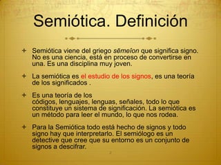 Este documento presenta una introducción a la semiótica y ofrece instrucciones para analizar un texto publicitario desde una perspectiva semiótica. Explica que la semiótica estudia los signos y cómo se construyen los códigos. Luego, detalla cinco pasos para analizar un anuncio publicitario: 1) identificar el significante y significado, 2) analizar los modos icónico, simbólico e indicial, 3) buscar intertextualidad, 4) analizar elementos retóricos, y 5) aplicar conceptos lingüísticos y