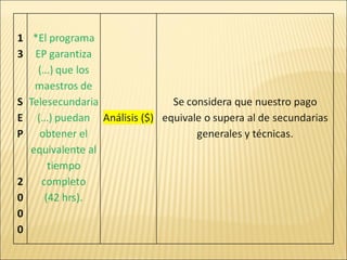 El documento discute varios temas relacionados con las condiciones laborales de los maestros de telesecundaria en Jalisco, México. Propone nuevos esquemas para el programa Escuela Productiva que incrementarían las horas de trabajo. También menciona acuerdos previos sobre promociones, capacitación y basificación que no se han cumplido adecuadamente, dejando a muchos maestros sin esos derechos y beneficios. Los sindicatos parecen no haber defendido adecuadamente a los maestros en estos asuntos.
