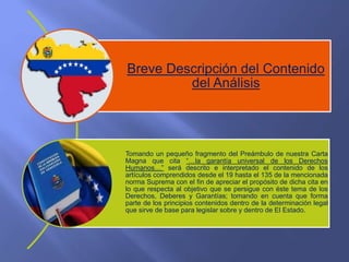 El documento analiza los artículos 19-135 de la Constitución de Venezuela, los cuales tratan sobre los derechos, deberes y garantías de los ciudadanos. Se resumen los temas clave de cada capítulo, incluyendo la nacionalidad, ciudadanía, derechos civiles, sociales, culturales, económicos, de los pueblos indígenas y ambientales. También se cubren los derechos políticos y el referéndum popular. El objetivo es apreciar cómo estos artículos garantizan los derechos humanos m