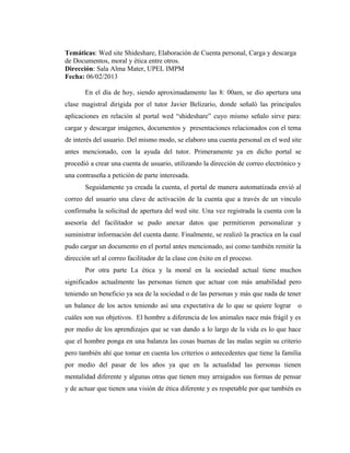 El documento describe una clase magistral sobre el sitio web Shideshare. Se explicó cómo crear una cuenta personal en el sitio, cargar y descargar documentos. Los estudiantes crearon cuentas, personalizaron sus perfiles y cargaron con éxito un documento. También se discutió brevemente la ética y moral en la sociedad actual.