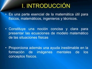Este documento presenta los conceptos fundamentales del análisis vectorial. Introduce vectores y escalares, y explica que los vectores requieren una magnitud, dirección y sentido para expresarse. Luego describe las propiedades de los vectores, incluidas las operaciones de suma y resta vectoriales, y la multiplicación de un escalar por un vector. Finalmente, introduce los conceptos de producto escalar y producto vectorial, incluyendo sus propiedades y aplicaciones geométricas. El documento proporciona una visión general completa de los principios básicos del aná