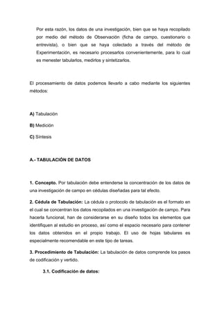1) El documento habla sobre el procesamiento y análisis de datos en la investigación de campo. 2) Explica que los datos deben ser tabulados, medidos y sintetizados para convertirse en información útil. 3) Describe métodos para tabular, medir y sintetizar los datos como tablas de frecuencias y diferentes tipos de gráficas.
