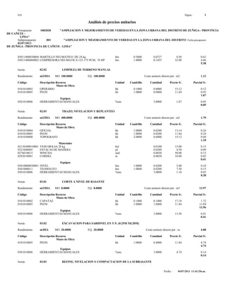 Este documento presenta un análisis de precios unitarios para un proyecto de ampliación y mejoramiento de veredas en el distrito de Zuñiga, provincia de Cañete, Lima. Incluye partidas como la construcción de un cartel de obra, almacén y caseta de guardián, movilización de equipos, demolición de veredas existentes, construcción de nuevas veredas y sardineles con piedra embocada. Para cada partida se detallan los recursos (mano de obra, materiales, equipos) requeridos y