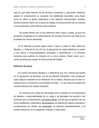 El documento describe los conceptos clave relacionados con el análisis y descripción de puestos, incluyendo las definiciones de cargo, puesto de trabajo, tareas y especificaciones. Explica los diferentes enfoques al diseño de cargos como la administración científica, las relaciones humanas y el enfoque situacional. Finalmente, destaca la utilidad del análisis y descripción de puestos para el reclutamiento, selección, entrenamiento y evaluación del desempeño.