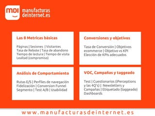 El documento detalla métricas clave para la analítica de ecommerce a través de Google Analytics, enfocándose en la importancia de medir páginas, sesiones, tasa de rebote y conversiones. Además, se discuten métodos para optimizar la interacción del usuario y mejorar la tasa de conversión mediante estrategias como segmentación, test A/B y análisis de comportamiento. Se resalta la necesidad de establecer objetivos claros y elegir KPIs significativos para evaluar el desempeño y ajustar las estrategias de marketing.