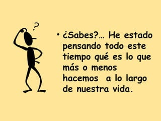 El documento describe la trayectoria vital típica de una persona desde la educación temprana hasta la vejez, enfocándose en la búsqueda del éxito profesional a través del estudio, el trabajo duro y la ambición, solo para darse cuenta al final que se ha perdido tiempo valioso y conexiones genuinas. Propone vivir una vida más equilibrada enfocada en las relaciones, la espiritualidad y el disfrute del presente.