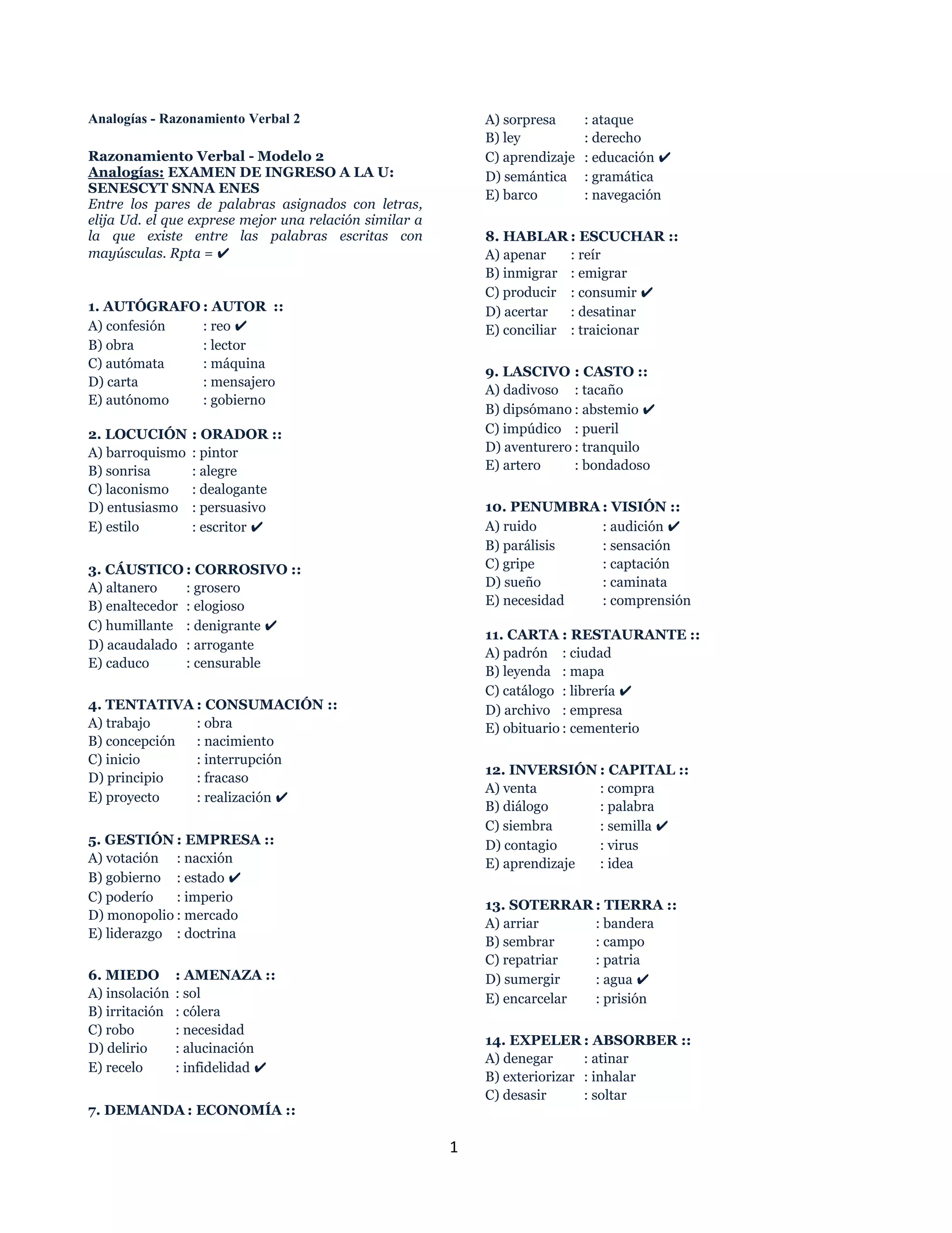 Este documento presenta 30 preguntas de analogías como parte de una prueba de razonamiento verbal. Cada pregunta consiste en una pareja de palabras en mayúsculas y 5 opciones de pares de palabras en letras. El objetivo es elegir la opción cuya relación entre sus palabras sea similar a la relación entre las palabras en mayúsculas.