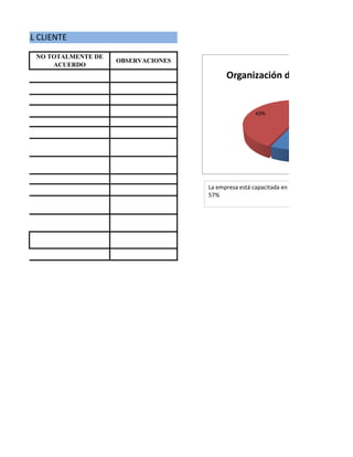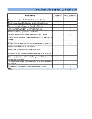 El documento describe las capacidades y prácticas de una empresa para brindar servicio al cliente, incluyendo un área designada para servicio al cliente, horarios establecidos, protocolos para atención, uso de software, buzón de sugerencias, encuestas de satisfacción, capacitación a empleados, incentivos para clientes habituales, bases de datos de clientes, portafolio de productos, percepción del cliente, reconocimiento a empleados destacados y eventos para empleados durante el año.
