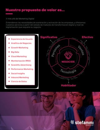 Este documento describe los servicios de marketing digital que ofrece Stefanini para ayudar a las empresas a comprender mejor a sus clientes, optimizar la experiencia del usuario, y aumentar las ventas. Stefanini utiliza análisis de datos, automatización, y plataformas digitales para ofrecer campañas de marketing multicanal personalizadas y en tiempo real. El objetivo final es crear relaciones a largo plazo con los clientes y generar transacciones rentables.