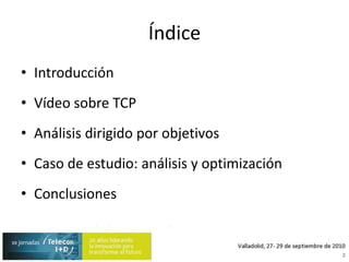 Este documento presenta un análisis y optimización del descargado de videos en dispositivos móviles. Integra las herramientas SPIN y ns-2 para realizar un análisis parametrizado dirigido por objetivos de escenarios de descarga de videos sobre TCP en entornos móviles sujetos a desconexiones. El enfoque propuesto reduce significativamente el tiempo de análisis al enfocarse sólo en simulaciones que cumplen los objetivos especificados.
