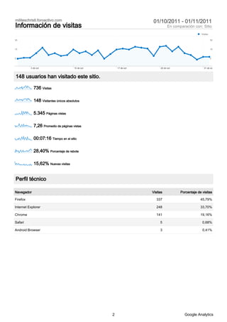 Este documento proporciona estadísticas y análisis sobre el uso del sitio militeschristi.foroactivo.com entre el 1 de octubre y el 1 de noviembre de 2011. Recibió 736 visitas de 9 países, con 5,345 páginas vistas y un promedio de 7.26 páginas por visita. El tráfico directo representó el 46.88% de las visitas, mientras que los motores de búsqueda y los sitios web de referencia representaron el 23.10% y el 30.03% respectivamente. El