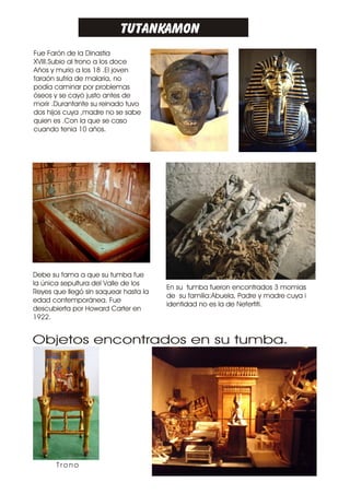 Tutankamón ascendió al trono a los 12 años y murió a los 18. Padecía malaria y problemas óseos que le impedían caminar. Durante su corto reinado tuvo dos hijos cuya madre se desconoce. Su tumba fue descubierta en 1922 por Howard Carter y contenía tres momias adicionales de su familia, así como numerosos objetos.