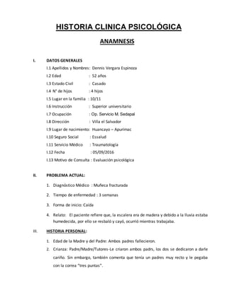 Este documento presenta la historia clínica psicológica de un paciente de 52 años llamado Dennis Vergara. Se detalla su información personal, motivo de consulta, historia médica actual, historia personal y familiar. El examen psicológico muestra que el paciente presenta procesos cognitivos, afectivos y conativos normales, aunque experimenta ansiedad e inseguridad en situaciones de presión. Se recomienda un plan de tratamiento y seguimiento.
