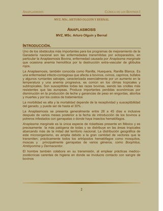 Este documento resume la enfermedad de la anaplasmosis bovina. Es causada por la bacteria Anaplasma marginale, la cual se localiza dentro de los glóbulos rojos bovinos y causa su destrucción, resultando en anemia. Se transmite principalmente por garrapatas. Los síntomas incluyen fiebre, debilidad y anemia. El diagnóstico se realiza mediante examen microscópico de sangre para detectar los cuerpos de inclusión de la bacteria dentro de los glóbulos rojos. No hay tratamiento efectivo,