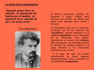 El documento resume la historia del anarquismo en España desde su llegada en el siglo XIX hasta la transición democrática. Se describe la fundación de la Confederación Nacional del Trabajo (CNT) en 1910 como principal sindicato anarquista y su evolución, incluyendo su participación en la Revolución social de 1936 y su exilio tras la guerra civil. También se explica la legalización de la CNT durante la transición y las divisiones internas que surgieron en ese periodo.