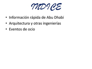 Abu Dhabi es la capital de los Emiratos Árabes Unidos, cubriendo un área de 67,340 km2 con una población de 860,000 habitantes. Ubicada en la parte noreste del Golfo Pérsico en la Península Arábiga, la ciudad de Abu Dhabi se encuentra en una isla a menos de 250 metros de la costa, con temperaturas promedio por encima de los 40°C en el verano.