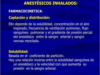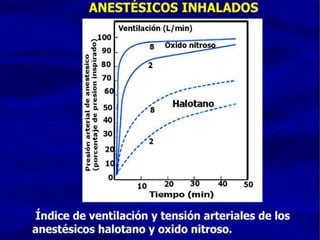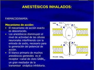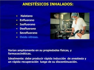 Este documento describe diferentes tipos de anestésicos generales, incluyendo gases como el óxido nitroso, líquidos volátiles como el halotano, e intravenosos como la ketamina. Explica sus indicaciones, dosis, farmacocinética, precauciones, contraindicaciones, reacciones adversas y almacenamiento. También destaca la importancia de los anestésicos generales en odontología para niños, pacientes con discapacidades o alergias a anestésicos locales.