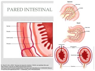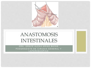 El documento describe diferentes técnicas de anastomosis intestinal, incluyendo anastomosis suturada a mano, con grapas y evidencia comparativa. Se discuten factores como suministro de sangre, tensión y técnica quirúrgica para una anastomosis exitosa, así como tipos de sutura y grapadoras. La evidencia muestra resultados contradictorios sobre si la anastomosis con grapas o suturada a mano tiene menos fugas, y que el tiempo quirúrgico es menor con una técnica.