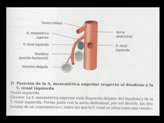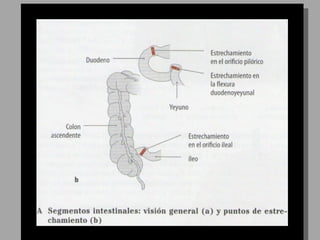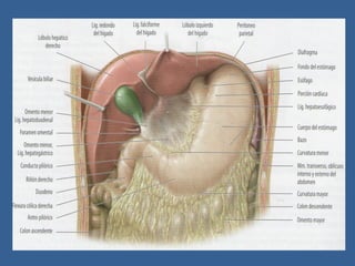 El documento describe la anatomía de la faringe, esófago, estómago y duodeno. La faringe se extiende desde la base del cráneo hasta el esófago y consta de músculos faríngeos. El esófago mide aproximadamente 25 cm y atraviesa el diafragma a nivel de T10. El estómago se localiza en el cuadrante superior izquierdo del abdomen y consta de cinco porciones. El duodeno mide aproximadamente 25 cm y rodea la cabeza del páncreas.