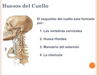 El documento describe la anatomía del cuello. El esqueleto del cuello incluye las 7 vertebras cervicales, el hueso hioides y la clavícula. La aponeurosis del cuello profunda tiene 3 hojas: pretraqueal, prevertebral y de revestimiento. El cuello se divide en compartimentos visceral, vertebral y vasculares. Los triángulos del cuello son el anterior y posterior, con el anterior subdividiéndose en submentoniano, submaxilar, carotídeo y muscular.