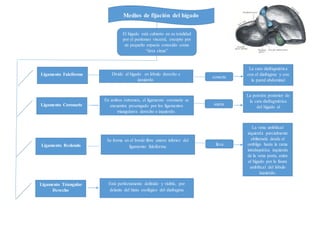 El documento resume los principales ligamentos y medios de fijación del hígado, incluyendo el ligamento falciforme, ligamento coronario, ligamento redondo, ligamentos triangulares derecho e izquierdo, y la vena cava inferior. También describe brevemente la vía biliar, por la cual la bilis es recolectada de los canalículos bilíferos hepáticos y transportada a través de los ductos biliar derecho e izquierdo, ducto hepático común, ducto colédoco, y finalmente a la segunda porción del duod