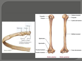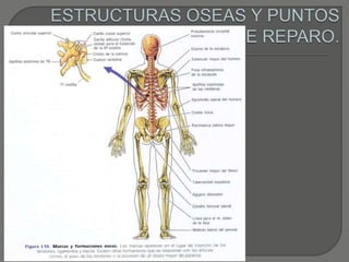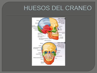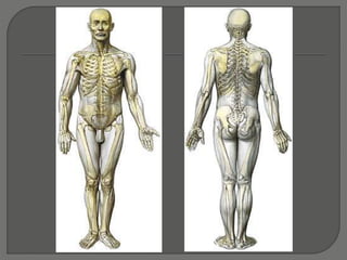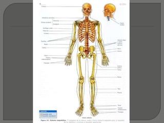 Este documento presenta una descripción general del esqueleto humano, incluyendo su clasificación en esqueleto axial y esqueleto apendicular, así como los principales huesos que lo componen. Explica que el esqueleto axial incluye el cráneo, la columna vertebral y la caja torácica, mientras que el esqueleto apendicular incluye los huesos de las extremidades superiores e inferiores. También define conceptos anatómicos como cabeza, cuello, carillas articulares y diferentes tipos de