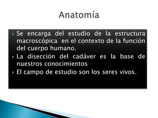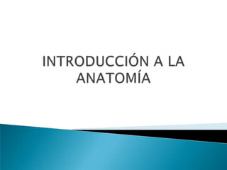 El documento introduce la anatomía como el estudio de la estructura del cuerpo humano en relación con su función. Explica que la anatomía se divide en macroscópica, microscópica y de desarrollo, y cubre los sistemas del cuerpo. También define la posición anatómica estándar y los términos como anterior, posterior, superior e inferior para describir las partes del cuerpo. Por último, explica varios tipos de movimientos como flexión, extensión, rotación y otros.