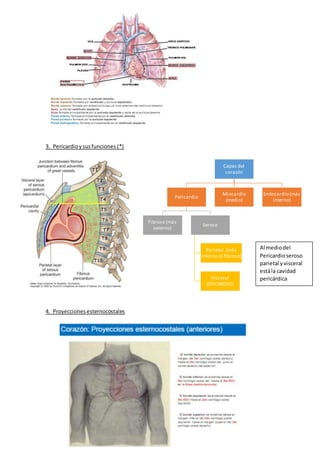 Este documento describe la anatomía del corazón y su funcionamiento. Explica las estructuras del corazón como las cavidades, válvulas y vasos sanguíneos, así como el recorrido de la sangre y el sistema de conducción eléctrico. Resalta que una perforación en el esófago puede dañar la aurícula izquierda debido a la posición inclinada del corazón, y que una herida en el quinto espacio intercostal derecho puede afectar el hígado.