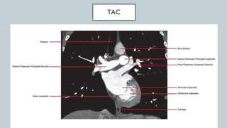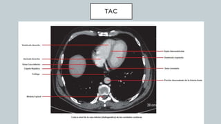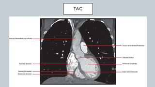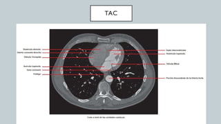 El documento detalla la anatomía del corazón y su ubicación en la caja torácica, incluyendo estructuras como las aurículas, ventrículos y arterias. También se abordan técnicas de diagnóstico por imagen, como radiografías y TAC, para visualizar la morfología cardíaca. La información está dirigida a estudiantes de medicina y profesionales interesados en la anatomía cardíaca.