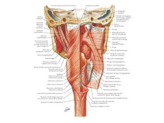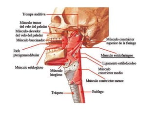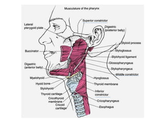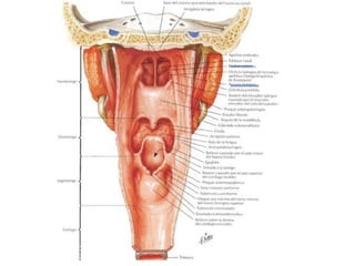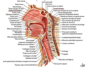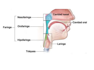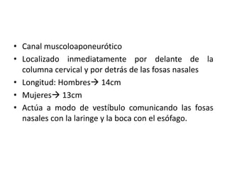 La faringe es un canal musculoaponeurótico localizado por detrás de las fosas nasales y por delante de la columna cervical. Está compuesta por cuatro capas: mucosa, fascia faringobasilar, capa muscular y aponeurosis perifaríngea. Contiene tres secciones - nasofaringe, orofaringe y faringolaringe - cada una con características anatómicas específicas y relaciones con estructuras adyacentes. La faringe conecta las fosas nasales, boca y laringe con el esóf
