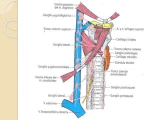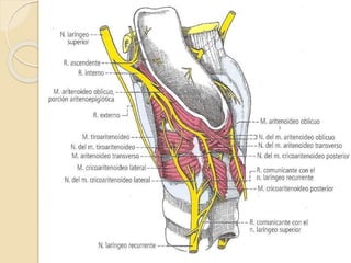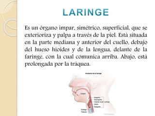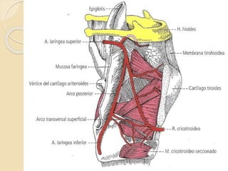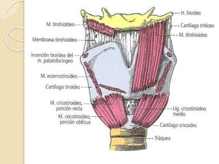 El documento detalla la anatomía quirúrgica de la laringe, un órgano crucial en la emisión de sonidos, compuesto por cartílagos y músculos que facilitan su función. Se describe la estructura de los cartílagos principales como el tiroides, cricoides y aritenoides, así como los músculos que actúan sobre ellos. Además, se abordan aspectos de la irrigación, drenaje venoso y linfático, así como la inervación mediante los nervios laríngeos superior y recurrente.