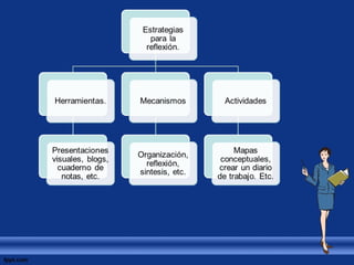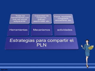 El documento presenta el concepto de PLE (Entorno Personal para Aprender) como el conjunto de herramientas, fuentes de información y actividades que una persona utiliza para su aprendizaje. También menciona la importancia de los espacios para compartir el conocimiento y comunicarse con compañeros. Se enfatiza la personalización del proceso de aprendizaje a través de estos entornos.