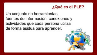 El documento describe el Personal Learning Environment (PLE) como un conjunto de herramientas y actividades utilizadas para el aprendizaje. Detalla el proceso de familiarización, búsqueda y manejo de información, diseño de presentaciones y la importancia de la reflexión metacognitiva en la educación. También resalta la necesidad de que los docentes posean competencias digitales para fomentar la autogestión del aprendizaje y la creatividad personal en un contexto digital.