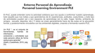 El documento describe el concepto de Entorno Personal de Aprendizaje (PLE). Explica que un PLE incluye todas las experiencias y actividades que nos ayudan a aprender, tanto dentro como fuera del aula. Define un PLE como el conjunto de herramientas, fuentes de información, conexiones y actividades que cada persona utiliza para aprender. Describe tres momentos en la evolución del aprendizaje: aprendizaje por repetición y modelo, aprendizaje con maestros y libros, y aprendizaje en la era digital con acceso ilimitado a inform