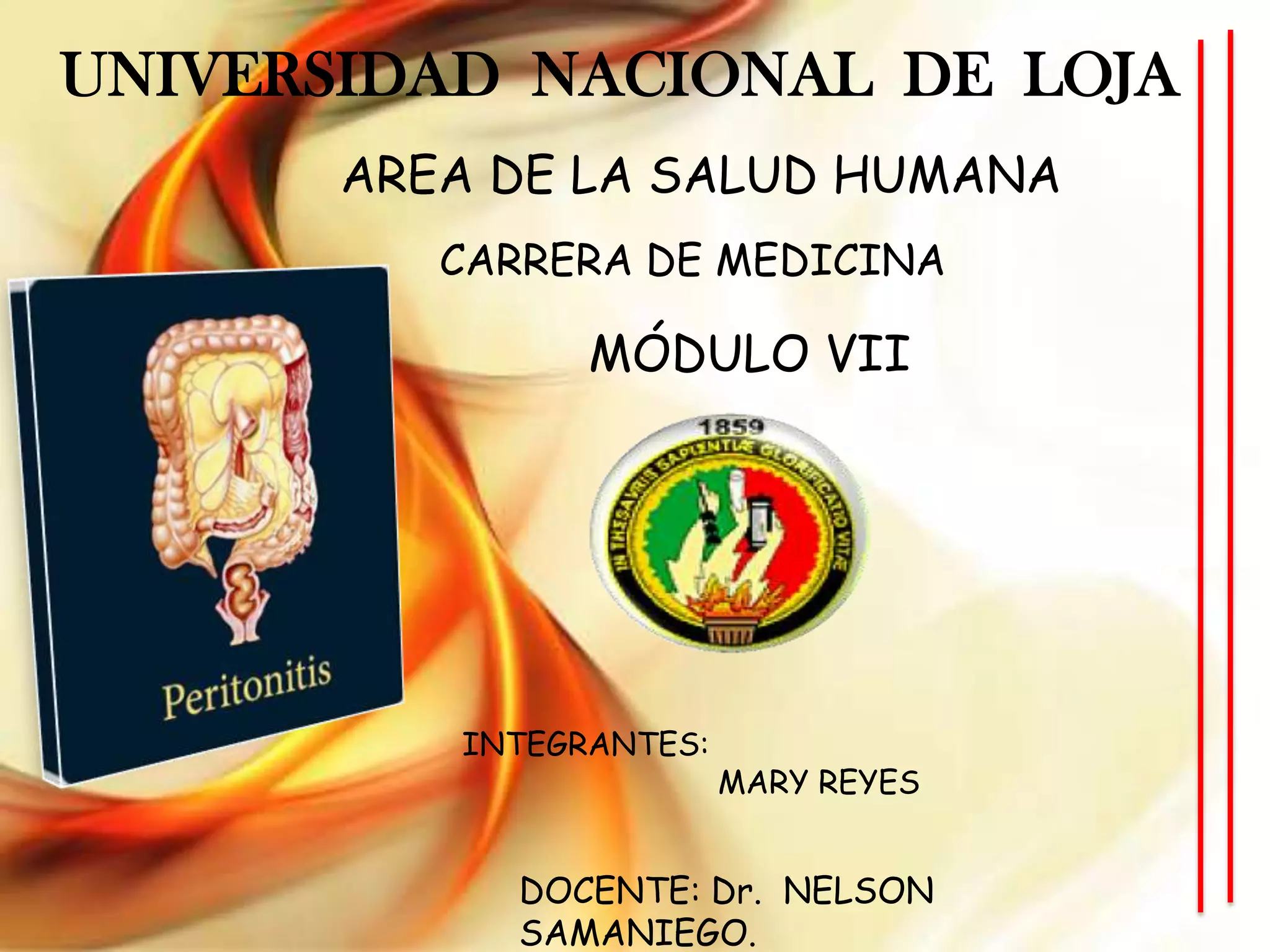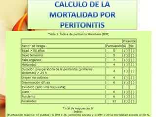 El documento aborda la anatomía y fisiología del peritoneo, así como las clasificaciones de los órganos en relación con esta serosa, y detalla los tipos de infecciones peritoneales: primaria, secundaria y terciaria. Se analizan los microorganismos causantes, síntomas, diagnóstico y tratamientos específicos para cada tipo de peritonitis. Además, se mencionan consideraciones sobre la terapia antibiótica y el enfoque quirúrgico según el estado del paciente.