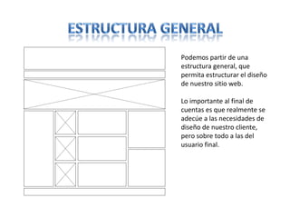 Este documento describe la estructura básica de un sitio web, incluyendo las secciones principales como el encabezado, navegación, área principal, contenido y barra lateral. Explica que el encabezado establece el estilo general y contiene la marca y llamadas a la acción, mientras que el área principal presenta el contenido focal y el contenido se enfoca en proporcionar información al usuario de manera fácil de digerir. Las barras laterales incluyen contenido secundario y enlaces.